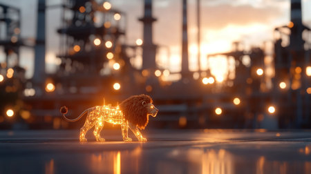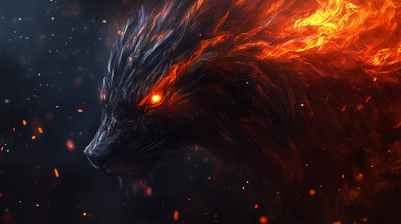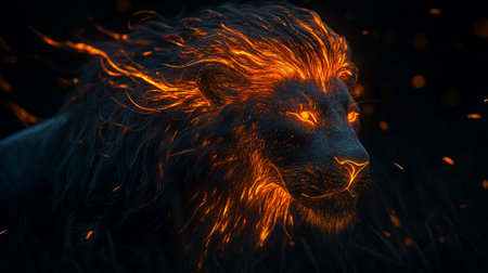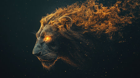 A close-up image presents a lion with a fiery mane and glowing eyes against a black background. The artwork uses warm, vibrant colors, emphasizing textures and details. The composition may be suitable for various commercial purposes, including advertising and editorial content. The lighting creates a dramatic effect.