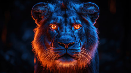 A striking portrait of a lion is illuminated with contrasting orange and blue hues. The image showcases the lion's detailed features and a dark background creating a dramatic effect. This artful composition, with its creative lighting, would be appropriate for various design and advertising projects.
