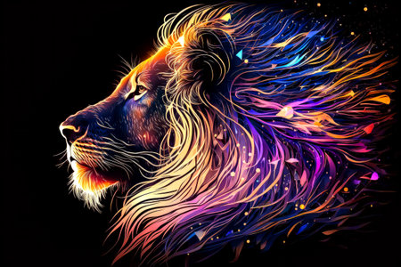 Profile of a majestic lion's head, mane ablaze with neon-like orange and blue lights
