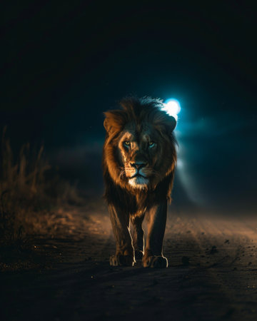 Majestic lion with a fiery mane is illuminated by colorful lights against a dark background