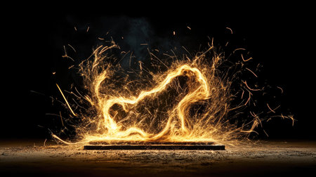A captivating image showcasing a dog silhouette formed from bright flames and sparks. The dynamic light effects create a visually stunning representation of energy and movement against a dark background.