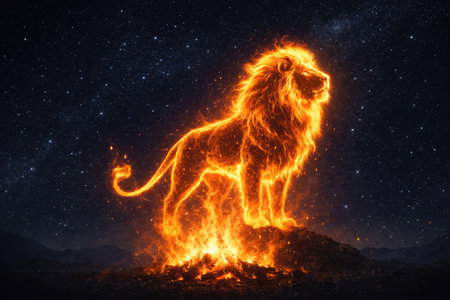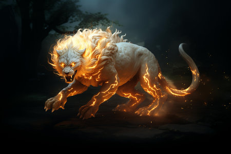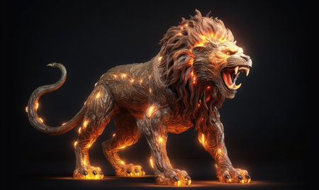 A majestic lion with fiery aura and fierce roar Creating using generative AI tools