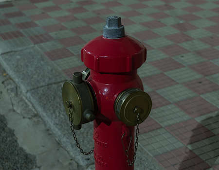 fire hydrant red white protection of the city on a background of gray tiles urban design