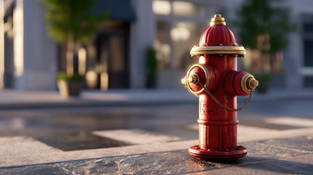 A bright red fire hydrant stands prominently on the city pavement, surrounded by soft lights and greenery, illustrating the harmony of safety and urban design in a modern environment.
