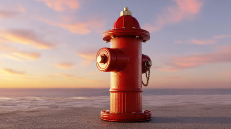 A vibrant red fire hydrant stands prominently against a stunning sunset sky. The soft clouds create a serene backdrop, emphasizing safety and urban infrastructure.