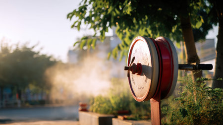 A striking red vintage fire hose reel stands against a backdrop of lush greenery and urban elements, illuminated by sunlight. The scene captures a sense of safety and preparedness in a tranquil outdoor setting.