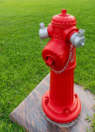 Red fire hydrant in city park, close up. Preventive measures against urban fires