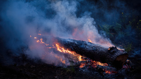 A fallen log is engulfed in flames, releasing spirals of smoke against a dusky backdrop, illustrating the raw power of nature's fire and light.