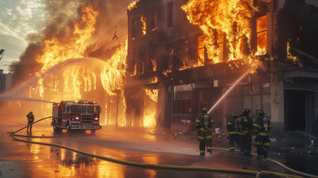 Firefighters battle a large fire engulfing a multi-story building, using hoses to control the blaze amidst surrounding flames and smoke.