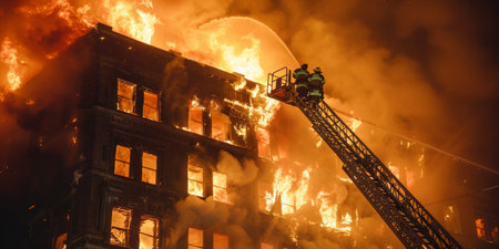 Firefighters battling a massive blaze in a multi-story building with dramatic flames.