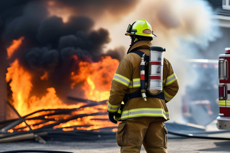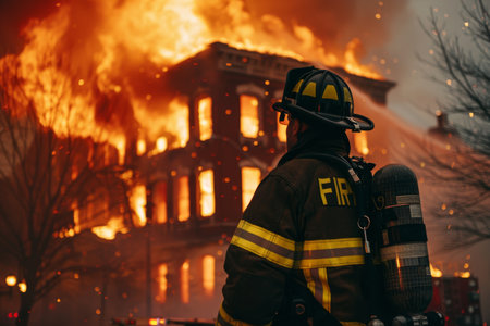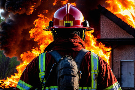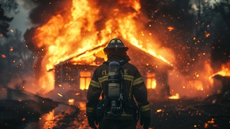 Fireman heading to tackle a blazing house amidst a fiery scene. Heroic firefighter in action against a home inferno. Concept of firefighting, bravery, emergency response, and risk.