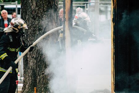 Reims France May 18, 2019 View of firefighters extinguishing a construction hut burned by rioters during protests of the Yellow Jackets in the streets of Reims on saturday afternoon
