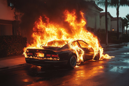 A luxurious black car is fully engulfed in flames, producing thick smoke against a darkened backdrop. The fire consumes the vehicle rapidly, attracting attention in a quiet parking lot at night.