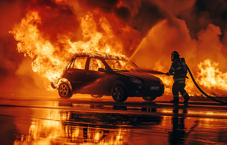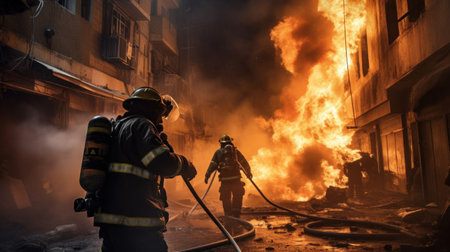 Firefighter battling flames with hose in hazardous smokefilled environment