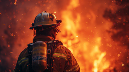 A firefighter stands with resolve against a fierce blaze, symbolizing bravery and the battle against nature's fury.