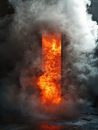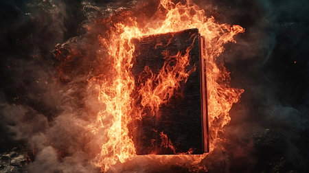 Closed book is burning intensely, engulfed in bright orange flames and surrounded by dark smoke, creating a dramatic and mysterious scene against a dark, textured background