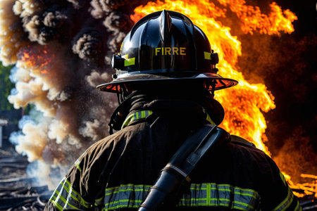 Firefighters battling blaze, intense flames, teamwork in action, heroic atmosphere