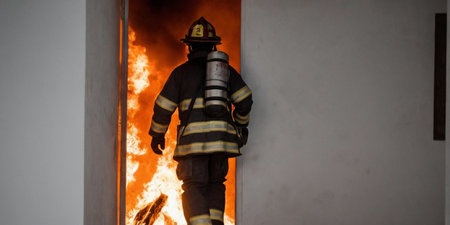 Firefighter in action at the scene of a fire in a building