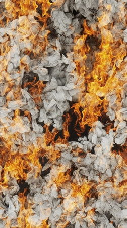 A pile of printed papers ignites fiercely, sending flames upward in an urban setting. The fire creates dynamic movements and intense heat.