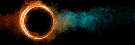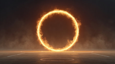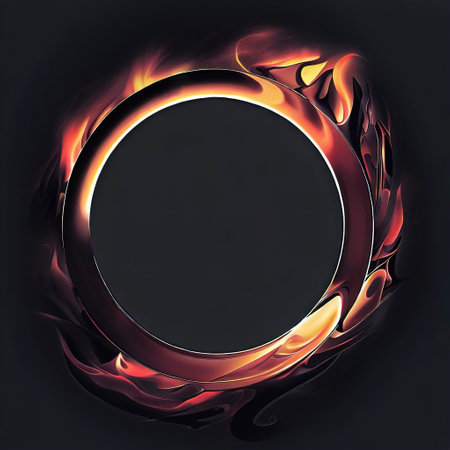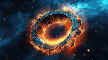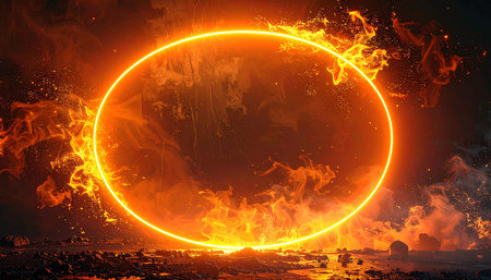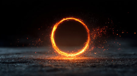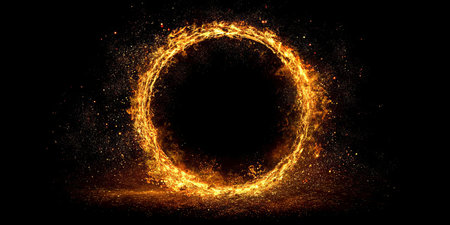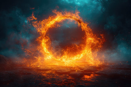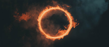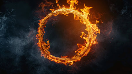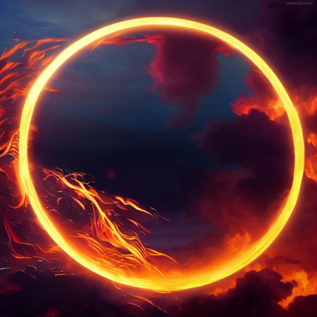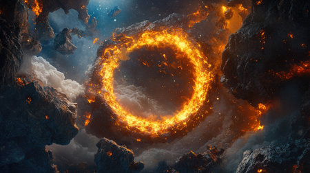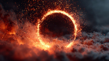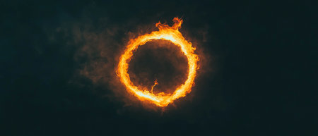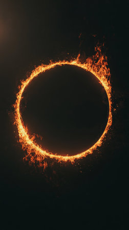 Flames forming a perfect circle burn brightly against a dark background, radiating energy and power while evoking cosmic events and the mysteries of the universe