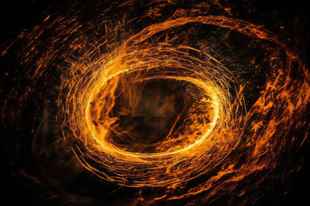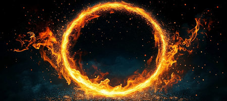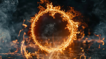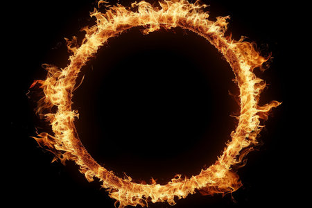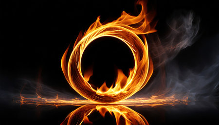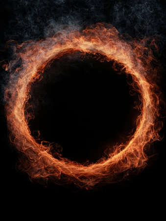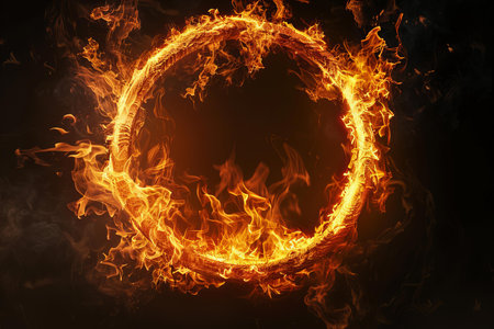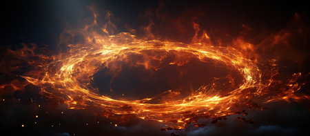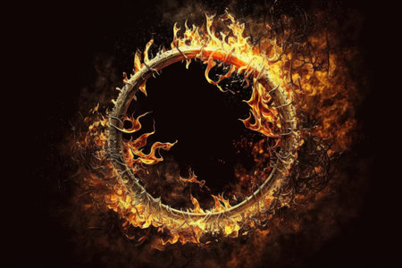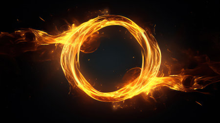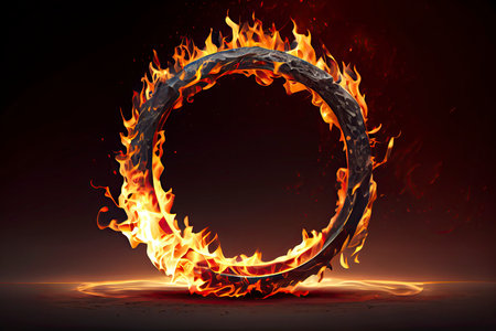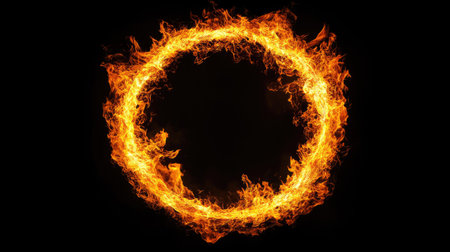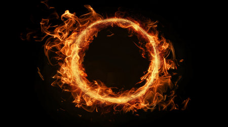 A captivating image showcasing a detailed ring of fire with vibrant, intense flames against a stark, dark background, creating a visually striking and mesmerizing effect conveying energy and passion. AI generated image