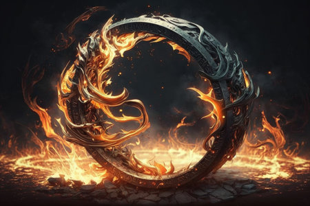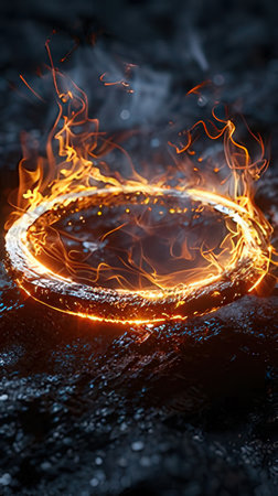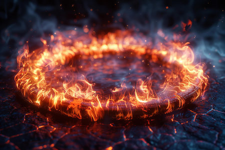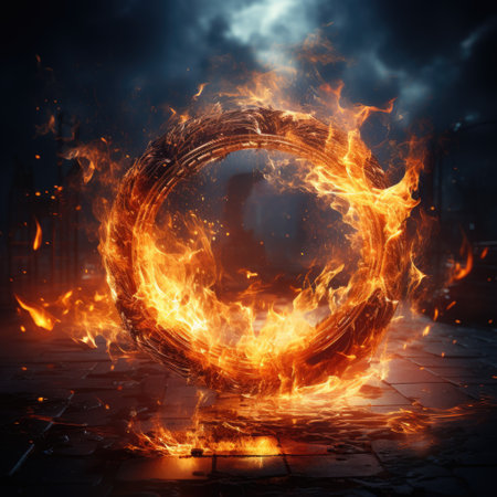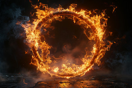 a ring of fire burns bright, an inferno of heat, power, and energy. fiery and intense, a hot blaze.