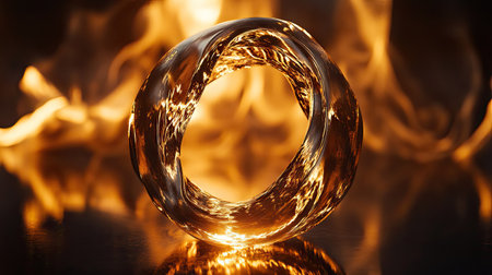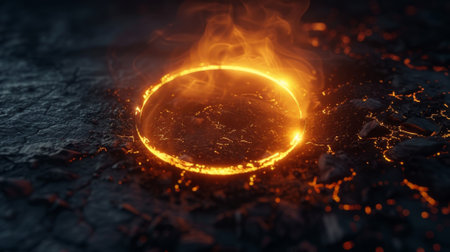 A stunning metal ring rests on a dark, textured surface as flames dance around it, creating a captivating visual effect in the low light.
