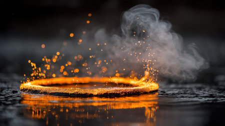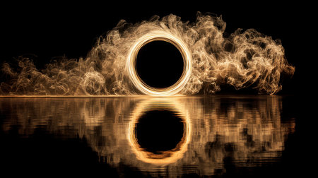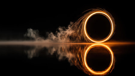 This captivating image showcases a glowing circular light trail reflecting on a dark surface, enhanced by swirling smoke effects.