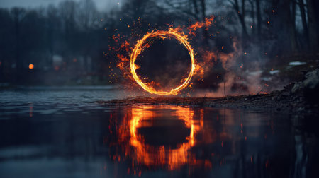 A mesmerizing scene featuring a glowing fire circle reflected in calm water at dusk, with trees standing tall in the background, creating a serene atmosphere.