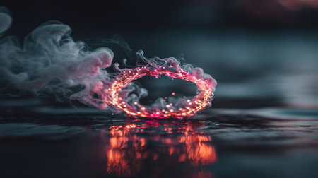 A captivating glowing ring emerges from dark waters, encircled by wisps of soft smoke, creating an ethereal atmosphere and mesmerizing reflection.