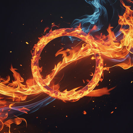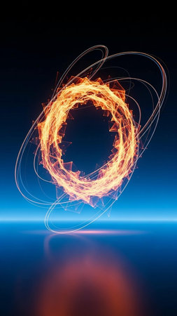 A glowing orange ring of fire with blue smoke wisps and sparks against a dark background. Clear details and vibrant colors enhance visual appeal.