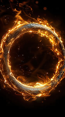 Fiery ring with swirling flames, each flame curling upwards, the intensity of the fire creating a dramatic, captivating effect.