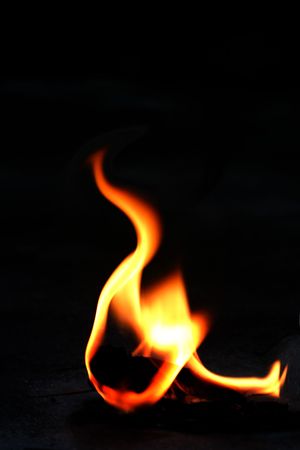 Dynamic flames rising against a dark black background, creating a dramatic contrast between the glowing fire and shadow