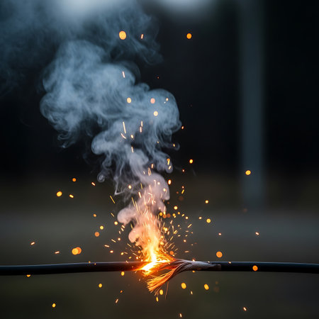 Intense close-up of a stressed metal wire snapping, sparks flying and fiery shards erupting amidst a blurred backdrop, capturing raw power and imminent failure.