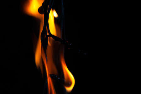 A beautifully burning branch of a dry conifer tree. Blurred background and flame. Defocused object