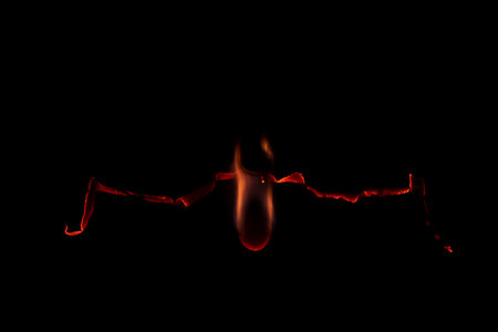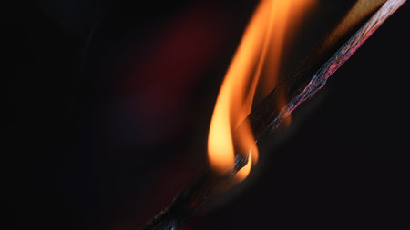 Burning match on black background of studio. The flame sizzles the wooden match and it gradually fades and dims. Concept of light and energy. Macro shot.