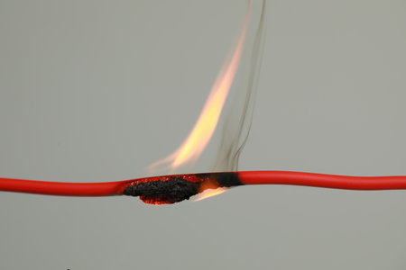 Inflamed red wire on gray background, closeup. Electrical short circuit