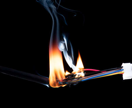 Electric cable wire broken or torn, power energy circuit, burning fire flame, connection break on black background