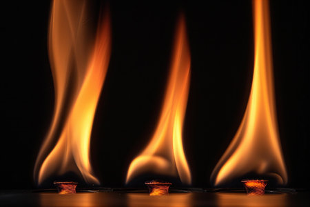 Group Of Matches Lit In Row Burning In Chain Reaction with Black Background.
