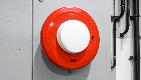 A close-up view of a red fire alarm with a white button is mounted on a grey panel.