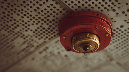 This image showcases a red emergency light fixture mounted on a textured ceiling, featuring warning indicators to enhance safety and awareness in dim settings.