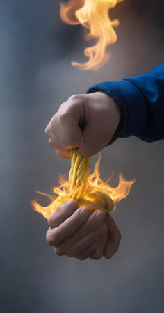 A powerful image of a hand painted blue, tightly bound by rope, raised defiantly amidst intense flames, symbolizing struggle and resilience. AI generation