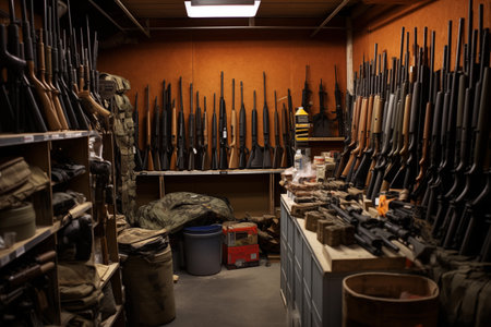 Weapon assortment on rack at store warehouse. Inside storage room with military equipment, arsenal of firearm. Generative AI