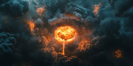 A captivating image of an explosion amidst dark, swirling clouds, showcasing vibrant orange flames and thick smoke, evoking a sense of power and chaos.