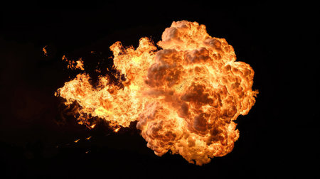 Fiery explosion of a large fireball, intense flames against a black backdrop