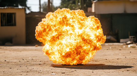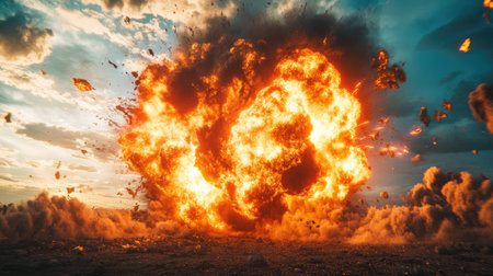 Massive explosion creating an intense fireball, dense smoke, and flying debris