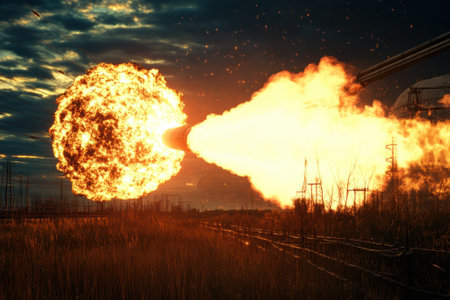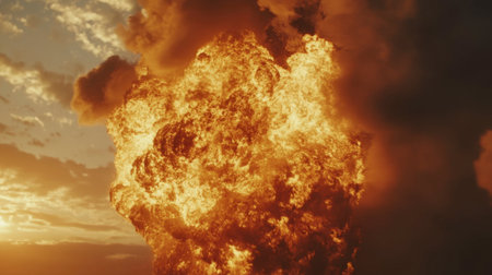A stunning image of a large explosion with vibrant flames and billowing smoke against a dramatic sky. Perfect for conveying power and intensity.