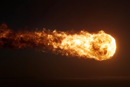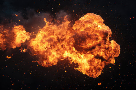 Dramatic explosion of fireball with intense heat and bright flames on dark background