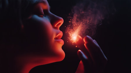 A person gently inhaling a glowing ember while shrouded in shadows against a dark backdrop in a dimly lit setting