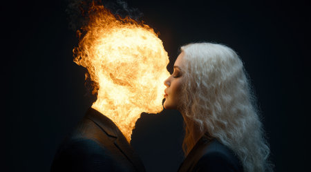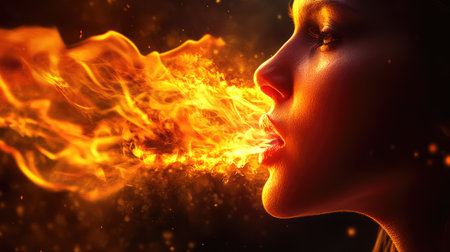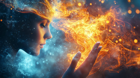 A woman's face partially illuminated by fiery flames, symbolizing passion, energy, and creativity, in a vibrant and ethereal setting.
